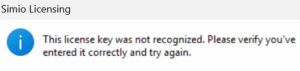 To resolve this error, consider temporarily disabling security measures or allowing communication between Simio and the internet (rlmactivation.simio.com). Consult your organization’s IT/infrastructure/security team(s) to ensure you are following best practices and protocols. Note, for student licenses: Some students have had more success activating their licenses on home networks, where there may be fewer restrictions than a campus network.