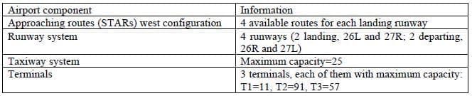 In order to validate the simulation model, the authors chose to apply the validation method: Historical data validation (Sargent 2007). This method is implemented when historical data is available. The method consists in using part of the data for building the model and using part of the data for validating it. In this work, the data used for building the model refers to the number and capacity of each components of the system such as: airspace approaching routes, runway and taxiway system and terminals. Average runway occupancy time as well as average taxiway and terminal occupancy time were derived from the historical data available. In Table 1, the main components of the airport are listed, for each of them, significant information about capacity is given.