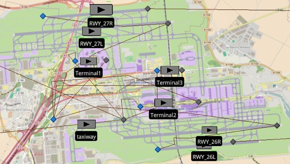 Regarding the airport airside components, runways, taxiway network and terminals were modelled by using server objects. Server objects were linked to each other by using connectors, a specific time-zero object path. In Figure 8. it can be seen part of the model animation of the airport airside and how these objects were connected to each other.