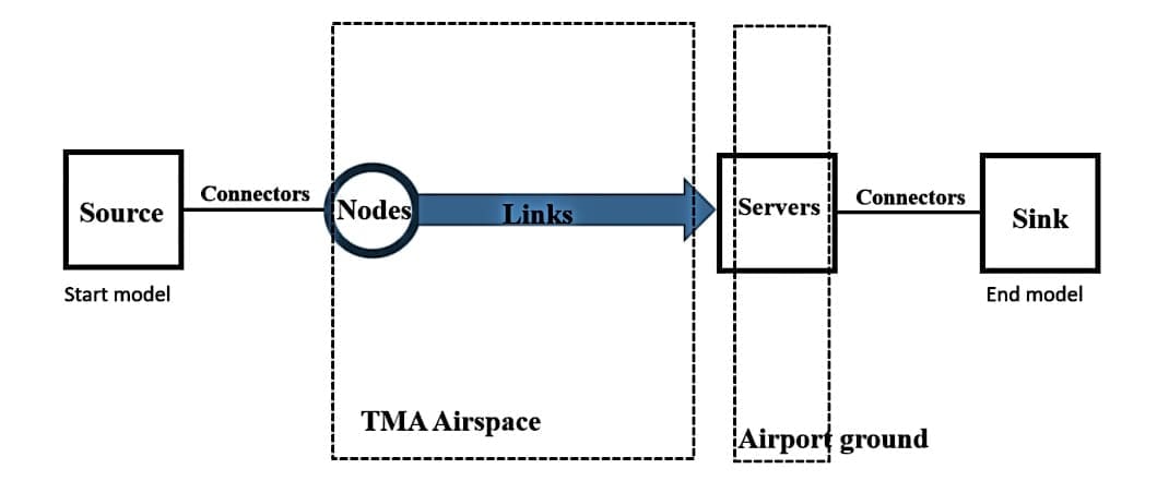 In the following sections, the modeling of airspace and airside operations are described in more detail.