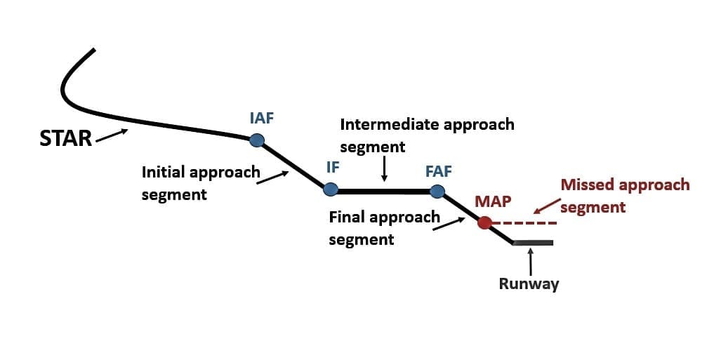Each runway can have one or more STAR/SID, each of them ensures aircraft to fly at a certain altitude level, under speed restrictions and following some significant points (waypoints). The last descending path before landing, under IFR, it is called instrument approach procedure. This procedure includes a series of predefined maneuvers that leads to landing at a predefined runway. The instrument approach procedure can be divided in two main segments, named initial approach segment and final approach segment. In some cases, another additional segment can be part of the instrument approach procedure, the intermediate approach segment. Figure 4 shows a schematic representation of them.