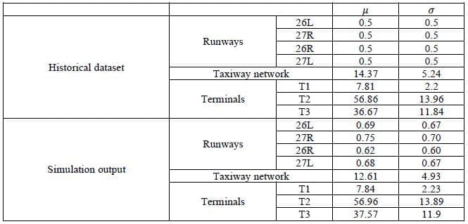 By looking at the results of Table 3, we can notice that regarding the runway occupancy, in the simulation model, runways appear to be more loaded as the average values are higher, as well as the standard deviations. Regarding the taxiway network occupancy, simulation model shows a less load on the taxiway compared to the original data, as average and standard deviation values suggest. Regarding the terminals, there is very little difference between the original data and simulation model average and standard deviation.