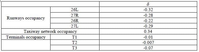 Looking at the values of 𝛿 for each variable analyzed in Table 4, we can derive that the magnitude of the deviation between the two datasets, historical and simulated, is not significant. The highest value of 𝛿 can be found for the taxiway network, which is 0.34, however, this value is close to zero. The variables regarding the runways, have values that range between -0.22 and -0.32, also for these variables the 𝛿 values are close to zero, which is the ideal scenario. The smallest value of 𝛿 is found for the terminals, with values that range between -0.01 and -0.007, revealing that the simulation output reproduces well terminal performance of the real system. Overall, the SMD test has highlighted that the simulation mode reproduces accurately the real system.
