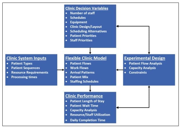 Building on this research, we aim to help address the issues of designing and analyzing effective and efficient outpatient clinics by developing a generalized simulation modeling framework. The reusable modeling approach will allow for capacity and patient flow analysis for the purpose of decision-making. The novelty of our modeling framework is how it expands upon the DEVs formulism and allows for scalability of atomic models (Zeigler et al. 2000). Additionally, this framework builds off the work proposed by Pérez et al. (2010), Alvarado et al. (2018), and Abo-Hamad and Arisha (2013) by enabling the components or atomic models that represent the clinic attributes (treatment rooms, staff, patient flows, etc.) to be altered by inputs driven through a data table. Moreover, the number of these attributes can be changed by data table inputs thus reducing the time required to model different clinics or alternative designs.