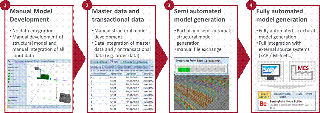 The requirement of operational planning support using simulation derives from the complexity of the planning process and the high number of system parameters that need to be controlled by a limited number of planning personnel on a daily basis. Because of frequent changes to both, master data and transactional data, and even structural changes of the line layout two technical requirements existed. First, the model should be ready to use within a very short period of time while still containing the latest data. Second, the process of incorporating the company’s data and creating the model should not involve manual tasks causing potential errors, time delays and inefficiency.