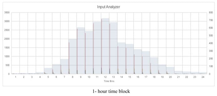 We start with the passenger arrival data for 5 days from an airport check-in counter. In general, we do not have information about what kind of stationarity we can consider for our dataset. In some cases the data are stationary session-to-session, month-to-month, week-to-week, day-to-day and so forth. We used the HistoRIA tool (Ansari et al. 2014) to characterize the sample arrival data. This is a graphical tool that helps the user assess the stationarity of a process over time. To simplify our initial work, we assume our data are stationary on a day-to-day basis and that we can view the data as including 5 observations of a “generic day.”