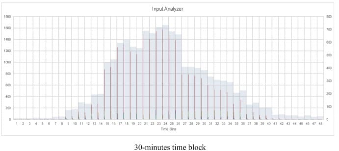 This tool gets all the passengers’ intervals for each day as the input and after calculating the interarrival times, converts them to corresponding timestamps. Using these timestamps the tool gives the HistoRIA plot as the output. For drawing the Historia plot, we should determine time block size which shows we are dividing the day to how many smaller intervals. The lengths of these time buckets are important because they must be short enough that arrivals during the interval see essentially the same system load, but long enough so that it is almost certain that there will be arrivals during each interval (Smith and Nelson 2015). In addition, we should determine the number of studying days which is in this case five and we are considering how many hours in a day. Figure 1 shows two sample HistoRIA plots for the given dataset. In the first HistoRIA plot, each time block represents one hour and in the second plot, each represents one half an hour. Therefore, there are 24 and 48 time blocks, respectively. In each time block, the gray area is the estimated arrival rate (𝜆(𝑡)). As it can be seen in the figure, the average arrival rate in hourly blocks is almost equal to average of the corresponding 30-minute blocks’ arrival rates, so it seems reasonable to choose our time bucket equal to one hour for this data set. We used the estimated arrival rate in 1-hour time bucket as the input for our airport check-in model in Simio.