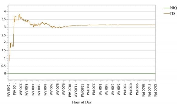 As mentioned above our goal is determining number of servers as the function of time, we consider the airport check-in system with nonstationary passenger arrivals and we focus on the system from both airport manager and customers’ views, so with having optimal staffing levels they all will be satisfied. If there were no server constraints there would be no waiting time in the system, but this would almost certainly waste capacity since the arrivals are stochastic and nonstationary. Figure 2 shows a dynamic status plot for one replication of the model with infinite server capacity assumption. This plot shows the number of passengers in the queue (NIQ) and overall time in system (TIS) over simulated time. There are no passengers in the queue, the average time in queue is zero (both TIQ and NIQ remained zero during simulation time) and the average time in system in hourly buckets is almost equal to mean service time which is 3 minutes – exactly what we expect. Unfortunately for flyers, infinite server capacity is not practical.