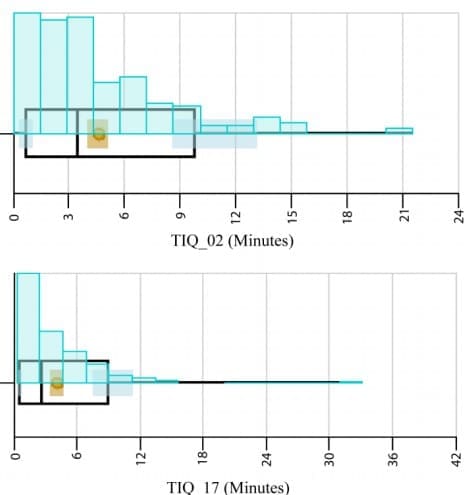 The above discussion gives us good information about the average time-in-queue by hour and we used replications to computes confidence intervals. It would be risky for the manager to decide about staffing levels only based on the average waiting time in queue because it contains variability and customers cannot rely on only average waiting time to plan their leaving time from house for the same reason. We can calculate the standard deviation of these mean time-in-queues using the reported confidence interval halfwidth from the SMORE plot but this standard deviations give us information only about bucket means waiting time rather than the individual ones and risk-averse passengers cannot plan only based on the average waiting time in queue. We used the approach of Smith and Nelson (2015) to calculate individual standard deviations. We ran 300 replications of our model and used an external Python program to aggregate the data from these files for further analysis. Table 1 shows outputs of these analysis. For each time block we have the mean and standard deviation of passengers’ time-in-queue and number of observations. As mentioned before we have the highest arrival rate in 12th time bucket, and in this table we have highest sum of number of observation in these 300 replications in that bucket which is 218160 observations overall.