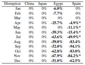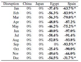 Wheat imports were impacted in only two of twelve disruption months for both China and Egypt, as displayed in Table 3. The impact to China can be traced back to its wheat imports from eastern Canada, as these shipments traverse the Strait of Gibraltar. Egypt is also sensitive to a closure here, most likely due to it importing wheat from the United States and Argentina, both of which use the strait as well.