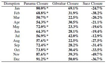 According to Table 8, should the Panama Canal close, the Strait of Malacca could expect at least a 51% arrivals increase (in the exports studied) in all months, as compared to the baseline, with a maximum increase of nearly double if the Panama Canal closed in the month of December.