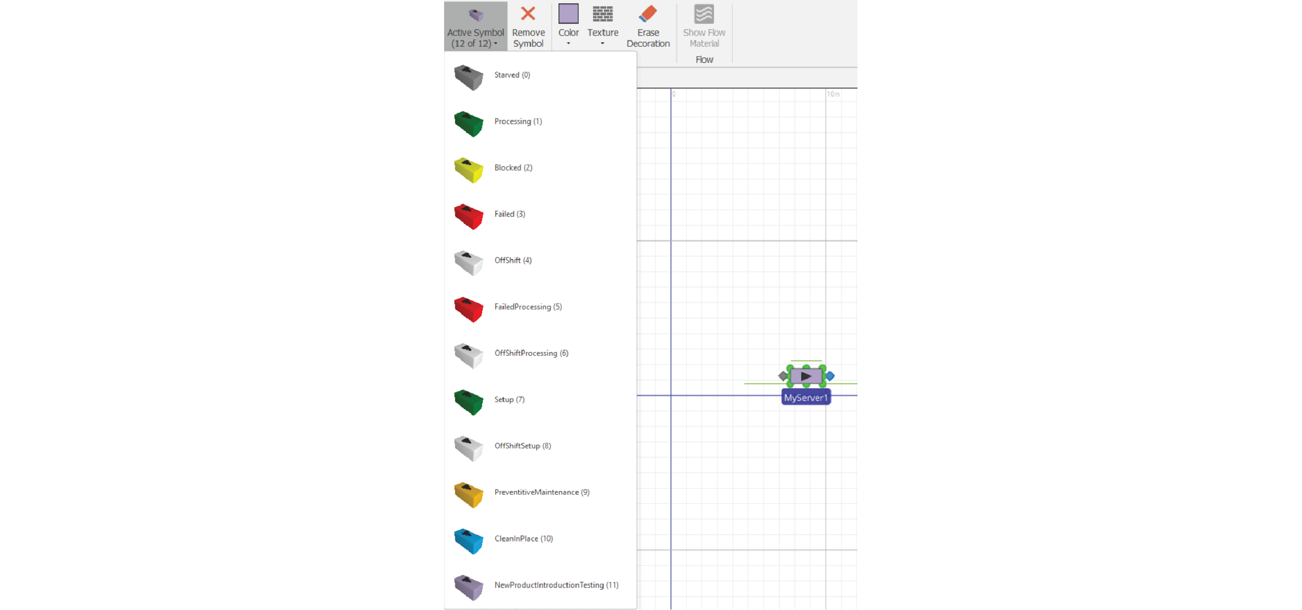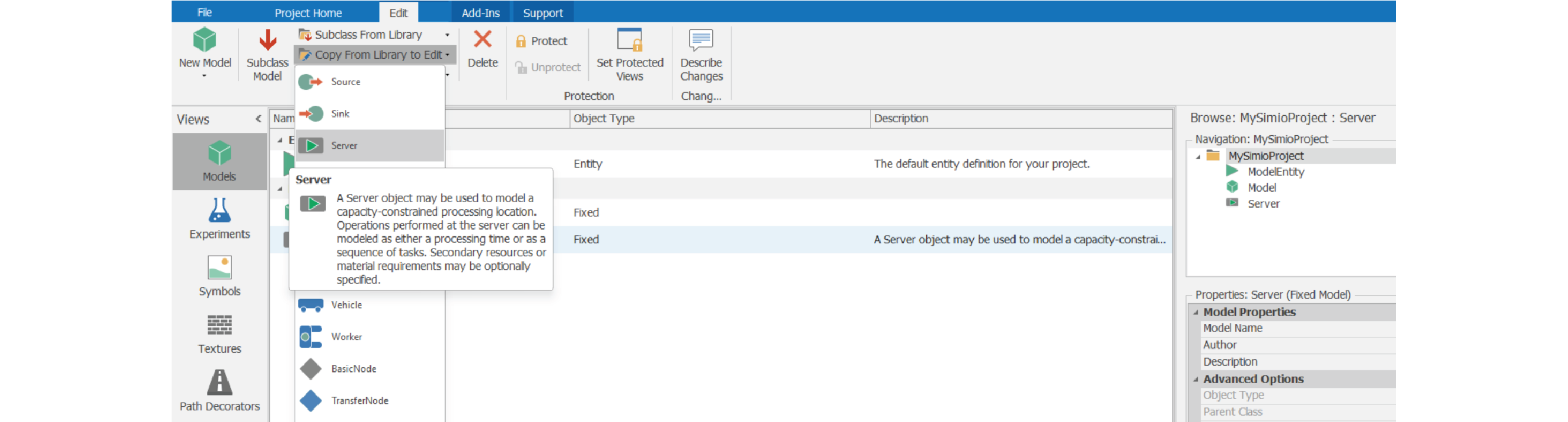 Les objets de Simio sont livrés avec plusieurs ResourceStates qui leur sont appliqués par défaut. Un Serveur, par exemple, a huit états différents dans lesquels il peut se trouver. Pour certaines applications, il peut être souhaitable de créer des états supplémentaires pour un Objet afin de fournir plus de granularité au type de travail effectué. Pour ce faire, commencez par sélectionner "Copier de la bibliothèque vers l'édition", puis choisissez un serveur. Renommez votre objet personnalisé avec un nom différent de celui de l'objet par défaut ("Mon serveur" est l'exemple ici).