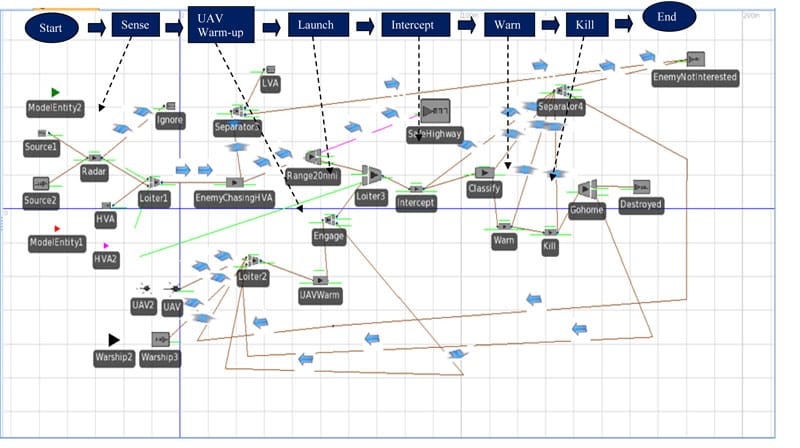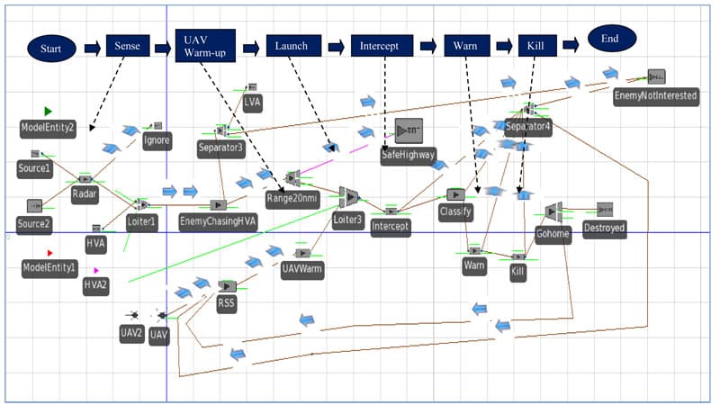 NPS used Simio to run several scenarios where a HVA would be defended by a warship with one or two Unmanned Air Vehicles (UAVs). NPS also tested how a HVA would be defended by a Remote Sea Station and two UAVs .