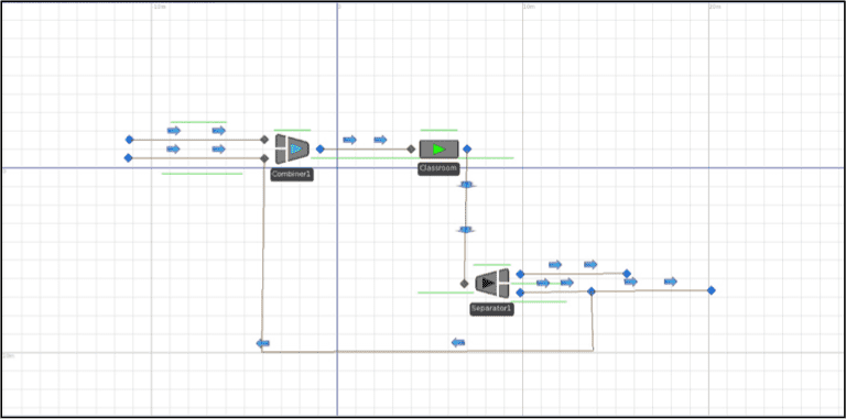 The education module is the aggregation of 12 grade levels and the community education. Blue Student paths allow students to return to the respective grade level after completing community education, whereas Brown student paths connect sequential grade levels to one another and to community education. The bold, blue path brings teachers back to the teacher pool for reassignment at the end of each school year.