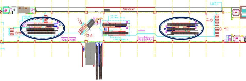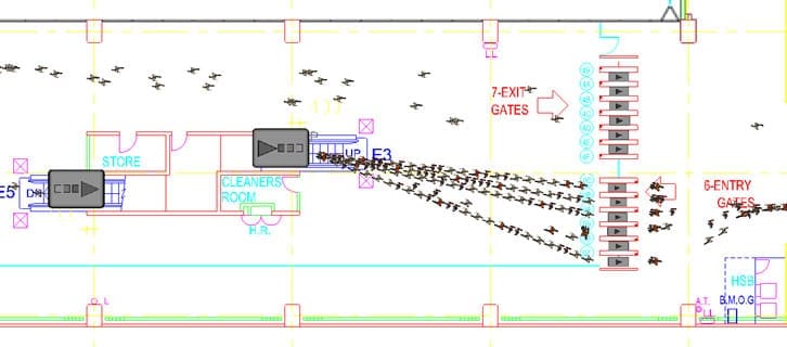 Passenger Mobility: Congestion. This screenshot reflects entrance A platform escalator at 28 minutes.Passenger Mobility: Congestion. This screenshot reflects entrance B platform escalator at 28 minutes.Passenger Mobility: Alternative 1 — Simple. This screenshot shows added escalators to double capacity. Direction can be changed to suit flow.Passenger Mobility: Alternative 2 — Intensive. This screenshot shows entrance C alterted. Escalators have been added and moved. Turnstiles and ticket machines have been moved.