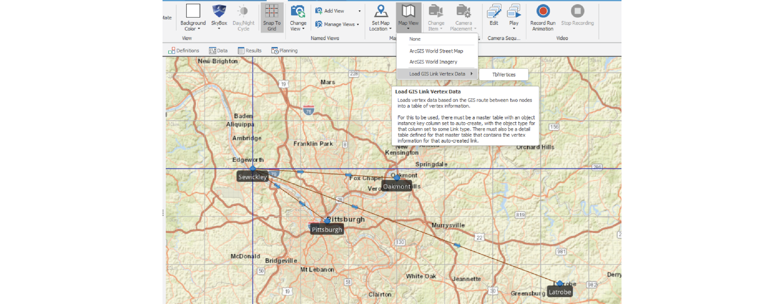 When auto-creating pathways using data tables, unless directly specified, pathways will be created in a straight line based on the location of the start and end nodes. New to Simio is the option to Load GIS Link Vertex Data. With this feature, as long as the table schema meets the requirements defined on the tool tip (sample table requirements seen below), the vertex data of each pathway between points of interested will be queried and loaded into the table that defines the vertices.