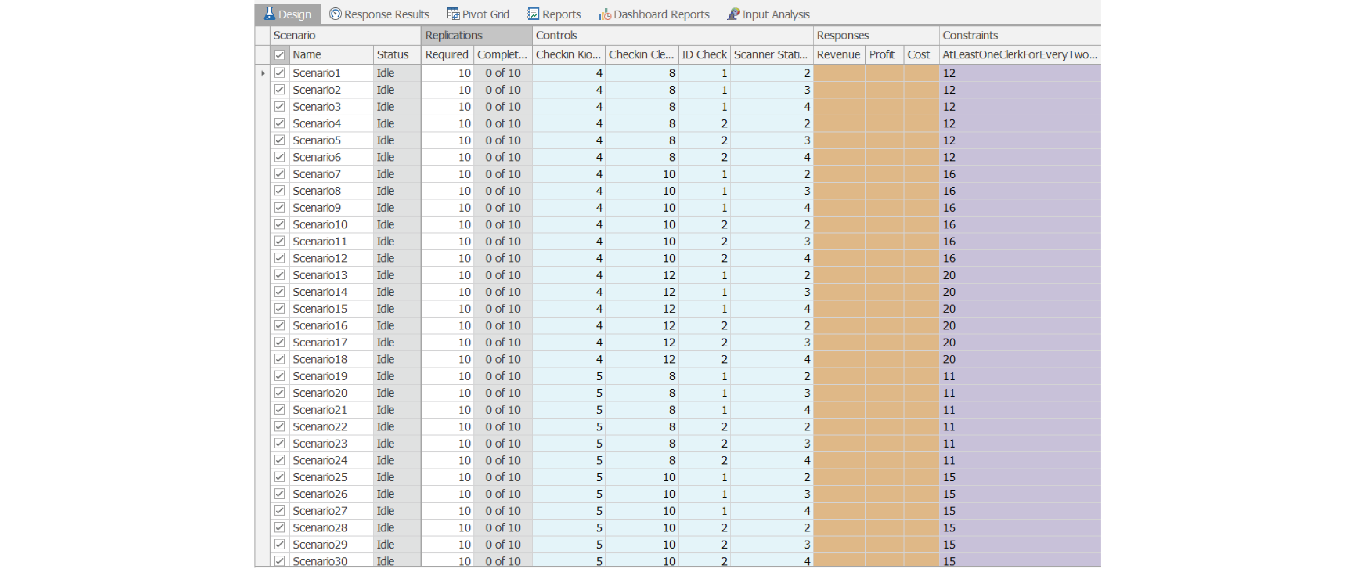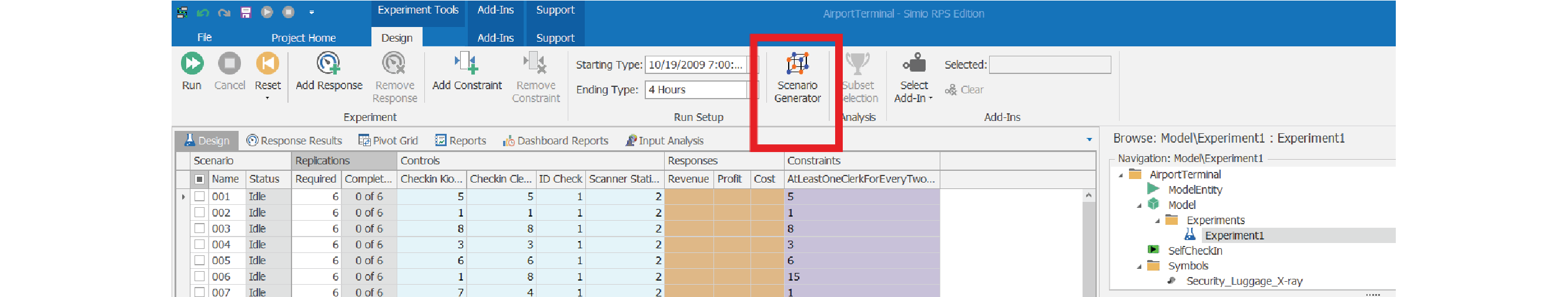 In the “AirportTerminal” model contained within Simio’s set of Examples, Scenario Generator can be used to setup an experiment for the four different preconfigured Controls.