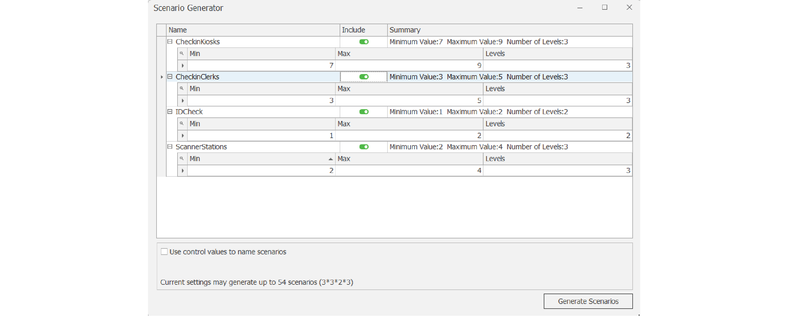 For each Control, uses can specify whether or not to include a Control in the Experiment (the Control will revert to the Default Value if not included), and for every Control that is included, the Minimum Value, Maximum Value, and # of Levels can all be specified and prepared for generation. On the bottom of the console, Scenario Generator will also preview the potential maximum number of scenarios to be generated, subject to any Experimental constraints that may be posed.