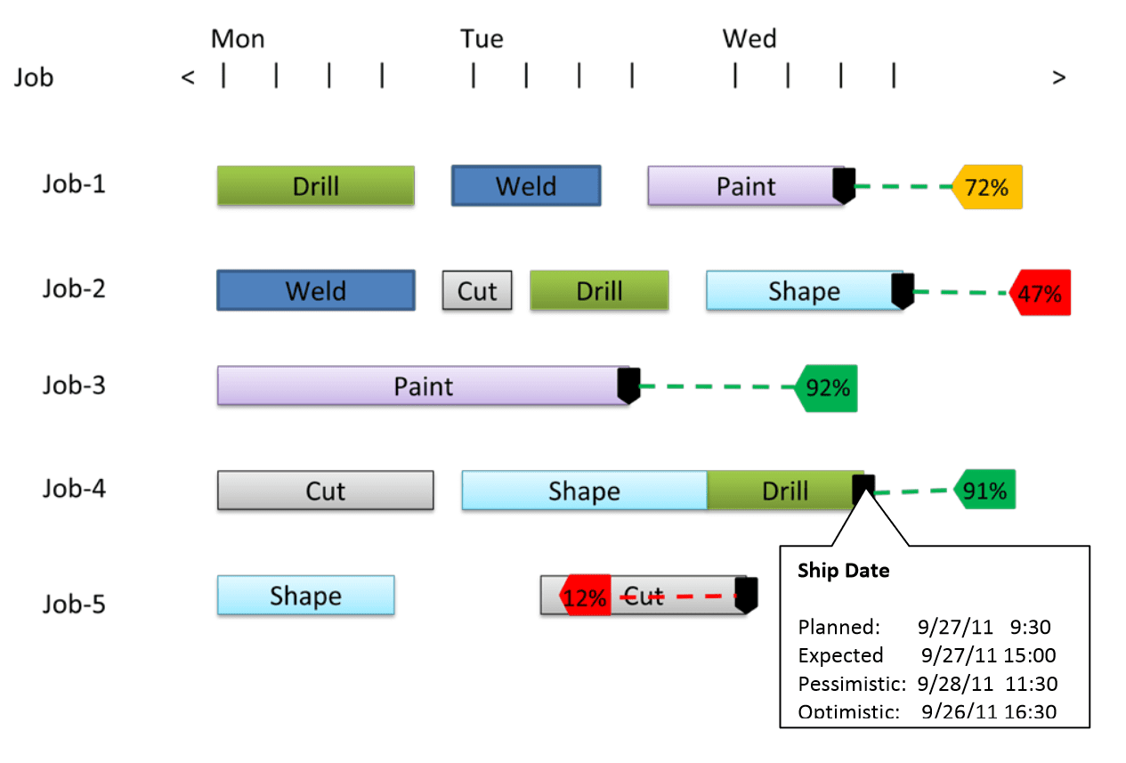 Note that with the addition of the likelihood estimates and color coded risk levels the scheduler can quickly see that jobs 3 and 4 are OK, whereas job 2 is at high risk, and job 1 is at moderate risk. The scheduler can then mitigate the risk by scheduling overtime, splitting batches, changing priorities, etc. The key point is that the scheduler has the risk measures in advance so that action can be taken now to ensure that critical customer orders are met in a timely fashion and at minimal cost to the operations.