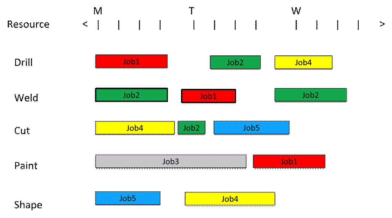 From a mathematical standpoint the general scheduling problem is classified as NP-Hard. This means there is no known efficient (polynomial bound) solution to the problem. Hence regardless of what scheduling products might infer by their name (e.g. Optimizer) or marketing claims – there is no algorithm or method that can generate an optimal solution to most real-life scheduling problems. The best that can be done is to try to efficiently generate a good feasible solution to the problem that properly considers the critical resource constraints in the facility.
