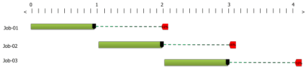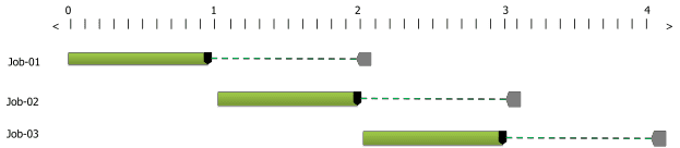 To illustrate this point we will take a very simple scheduling problem comprised of a single machine. On the average, jobs arrive to our machine every hour and require 55 minutes to process. They are picked up two hours after they arrive. Let’s look at a simple deterministic schedule for processing the first three jobs in our simple system. The Gantt chart for our schedule based on our deterministic times is shown below: